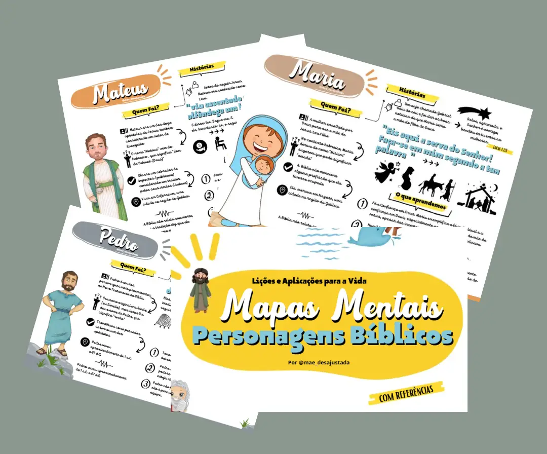 Mapas visuais e organizados de todos os personagens bíblicos, ajudando as crianças a conhecer suas histórias, virtudes e ensinamentos de forma simples e prática.